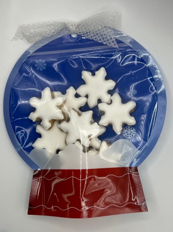 Bolsa grado alimenticio, con 10 mini bites de galletas en forma de copo de nieve. Nota: son pequeñas,
